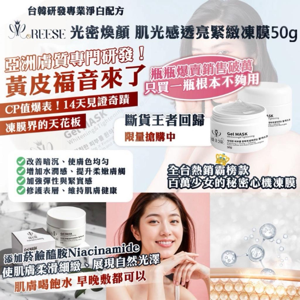 ✨敷出光感濾鏡肌!這瓶凍膜真的太可以✨ 熬夜臉黯沉?素顏沒自信? REESÉ光密煥顏凍膜直接幫你解決! 一抹瞬透亮,敷完肌膚像打了柔焦~ 💧極速補水✦深層亮白✦穩定膚況 ✅ 玻尿酸保水+菸鹼醯胺煥亮|肌膚喝飽水、自然發光 ✅ 質地清爽不黏膩|一敷就愛上,保濕又鎮靜 ✅ 睡前敷、隔天透亮|不用濾鏡,素顏直接發光! 📌 高效配方,專為亞洲膚質量身打造 📌 每天敷都OK,敏感肌也安心 📌 14天有感亮膚,皮膚細緻、暗沉Bye Bye👋 🌟 真實回饋  「一敷就透亮,妝感服貼到爆!」 「好用到會回購,不囤貨不安心!」 「連男友都問我是不是去做臉了」 產地:台灣 保存期限:3年