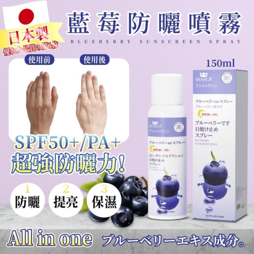 【日本製!藍莓防曬噴霧】✨🇯🇵 想要完美防曬又不失清爽?快來看看這款【藍莓防曬噴霧】,讓您輕鬆擁有夏日無懼陽光的肌膚!🌞🫐💦 ✅防曬 ✅防水 ✅防汗 ☑️保濕 ☑️遮瑕 ☑️提亮 🫐【藍莓萃取精華】🫐 添加藍莓萃取精華,不僅防曬,更能養膚!藍莓富含抗氧化成分,讓您的肌膚在陽光下依然健康有光澤。 🌞【SPF50+超強防曬】🌞 這款防曬噴霧擁有SPF50+的超強防曬效果,有效阻擋紫外線UVA和UVB,讓您無懼烈日,安心享受戶外活動! ✨【遮瑕提亮膚色】✨ 不僅防曬,還能提亮膚色!噴霧中的遮瑕成分,輕輕一噴,即可均勻膚色不死白!讓肌膚看起來更加明亮動人。 💧【保濕補水 不讓肌膚乾澀】💧 防曬同時不忘保濕!特別添加的保濕成分,給肌膚帶來源源不斷的水分,保持肌膚柔嫩不乾燥。 🚿【噴霧型防曬分子小 快速成膜】🚿 細緻的噴霧型設計,防曬分子小,能夠快速成膜,不留下白色痕跡,讓肌膚清爽不黏膩。 🍃【質地清爽不粘膩】🍃 輕薄的質地,清爽不黏膩,使用後肌膚感覺輕盈自在不卡粉,再也不怕厚重的防曬產品影響舒適感。 📏【便捷攜帶,隨時補噴】📏 輕巧瓶身設計,方便隨身攜帶,無論是出門逛街還是戶外旅行,都能隨時隨地補充防曬,保持肌膚最佳狀態! 讓【藍莓防曬噴霧】成為您夏日出行的必備神器,輕鬆享受無憂夏日!🎉🌞🫐 產品資訊🫐 品名:藍莓防曬噴霧 容量:150ml 產地:日本 有效期限:3年