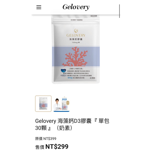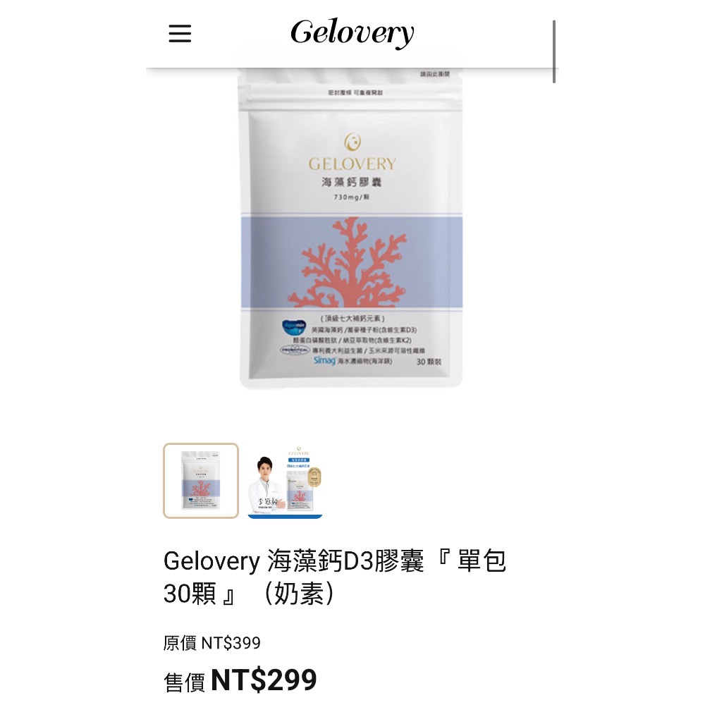 Gelovery 海藻鈣D3膠囊榮獲2024世界品質金獎🏆 全家補鈣首選,無論是孕婦、哺乳期媽媽、小朋友還是成人, Gelovery海藻鈣D3膠囊都是理想的補鈣產品! 每份膠囊含有1350 mg專利海藻鈣,鈣純量高達32%,相當於每份含432 mg鈣。 🎯 使用建議: 孕婦及哺乳期媽媽:可安全食用 小學以前兒童:一天1顆 小學生:一天2顆 國中及成人:一天3顆 專為全家設計的海藻鈣,從小到大、從孩子到長輩都能安心補充鈣質, 守護健康每一天! 【產品規格】 單包30顆,每份3顆,共10份。 包裝尺寸:10.5x16.5cm 【關鍵成份(每份)】 專利海藻鈣 1350 mg(內含鈣純量32%,鎂純量2.2%) 專利蕎麥粉D3 60mg (維生素D含量600 I.U.) 酪蛋白磷酸胜肽 225 mg 專利納豆(K2) 20.1 mg 專利義大利益生菌 42 mg 纖維輔料 105 mg 海水濃縮物(海洋鎂) 150 mg (鎂純量55%) 【使用方式】 1. 每日3顆,搭配常溫水使用,餐後使用更佳。 2. 若想改善睡眠或睡眠中抽筋症狀,可移至睡前使用。 【警語】 本產品含有牛奶、大豆及其製品,不適合對其過敏體質者食用