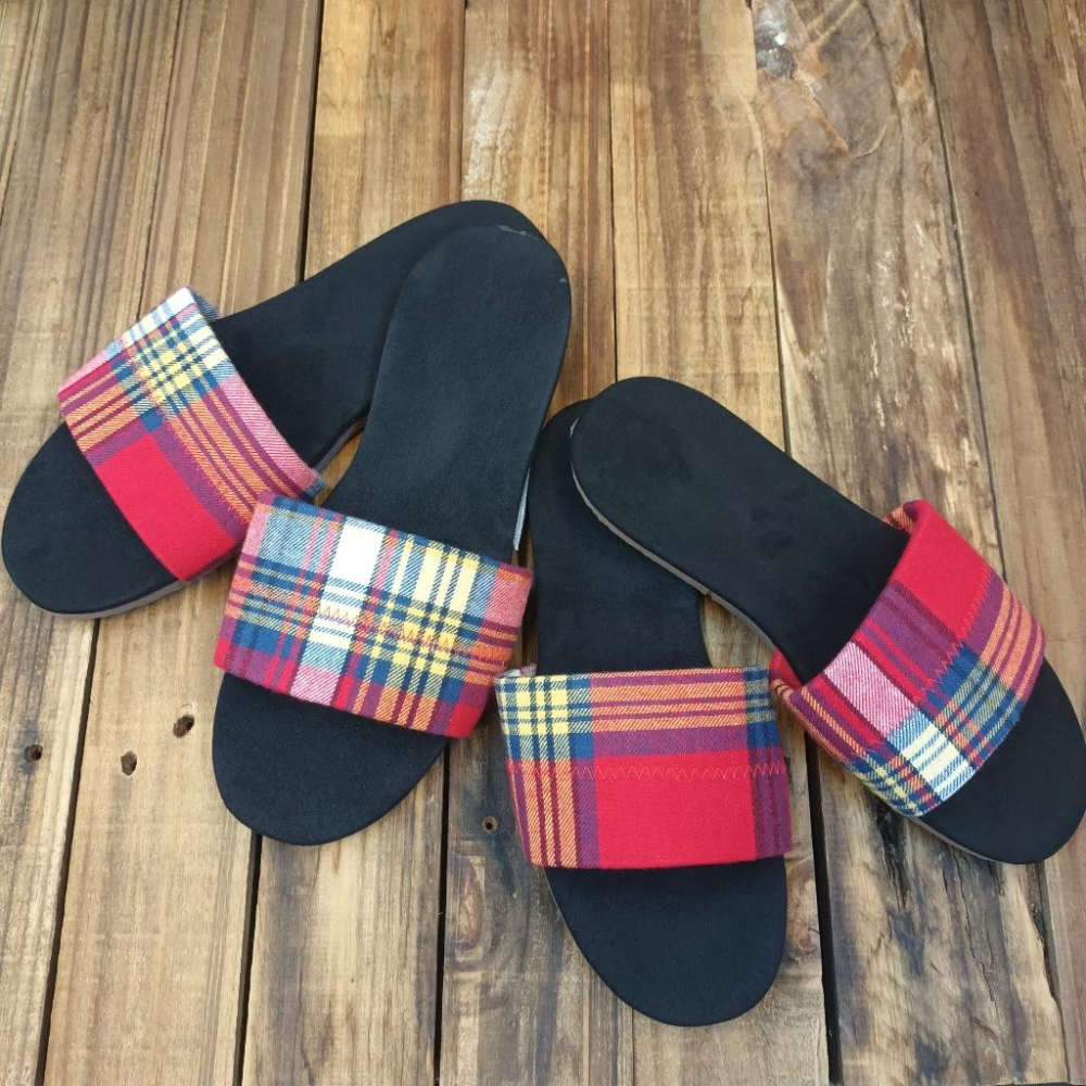 【雅鉑-無印】12403-1 紅格/黑 運動風室內拖鞋 格紋一字拖鞋 室內止滑拖鞋