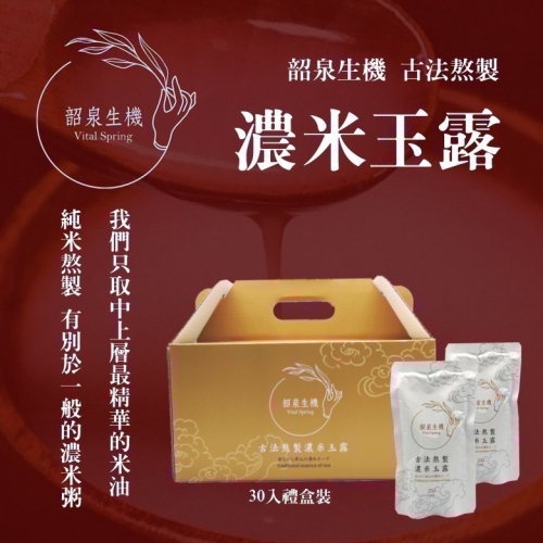 韶泉濃米玉露即為古中醫所稱之米油,本草綱目拾遺既有記載米油的功效,濃米玉露採古法經6小時熬製而成,只提取濃米粥最上層20%凝脂狀營養精華,營養高吸收快,可謂為素食的滴雞精,成分簡單,純天然無添加,適合各種體質人群,古代中醫養生智慧。