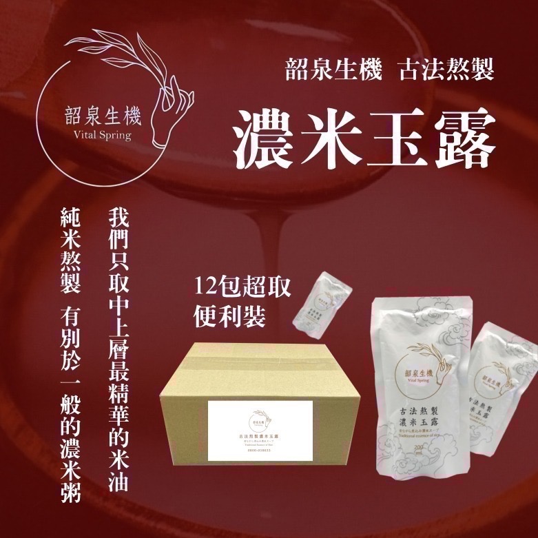 韶泉濃米玉露即為古中醫所稱之米油,濃米玉露採古法經6小時熬製而成,只提取濃米粥最上層20%凝脂狀營養精華,可謂為素食的滴雞精,成分簡單,純天然無添加,適合各種體質人群,古代養生智慧。