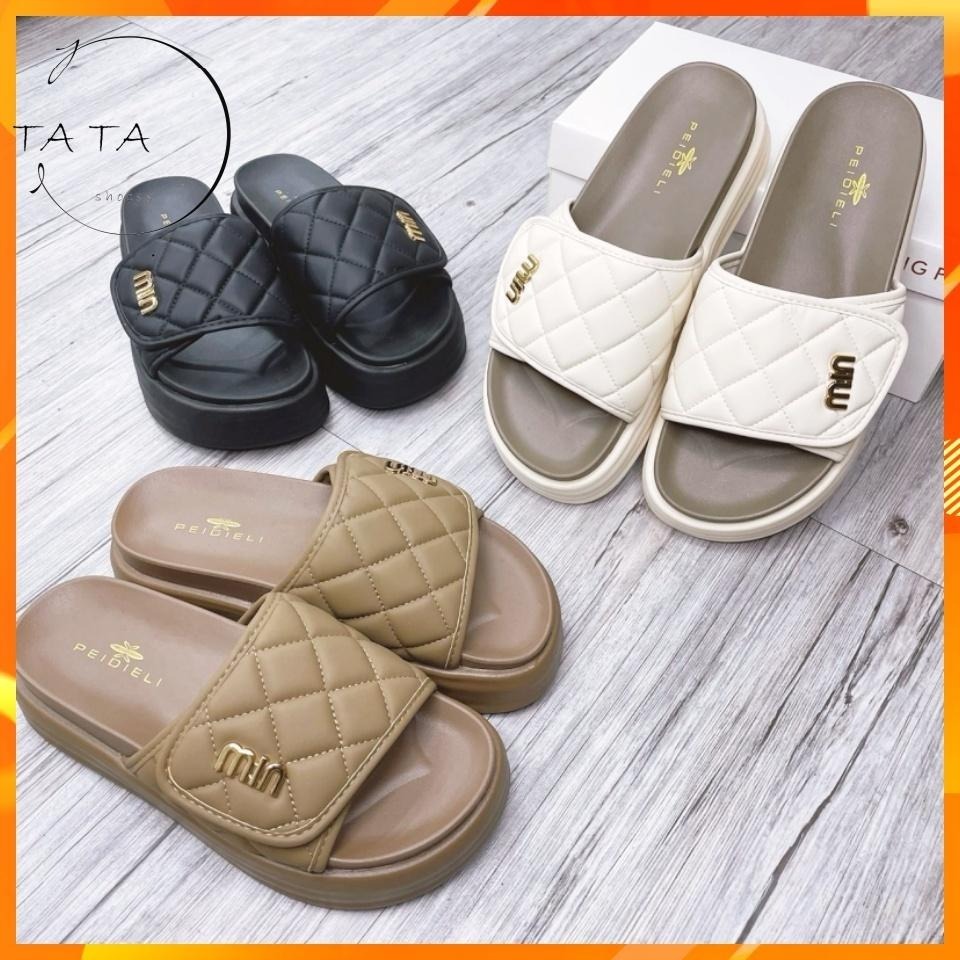 TATA【現貨➕預購】 皮面菱格紋小香風魔術貼涼拖鞋室外拖 室內拖2024新款百搭厚底一字拖