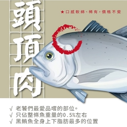 腦天是黑鮪頭頂部分的肉,魚頭上有一個刁鑽部位,只佔整條魚重量的0.5%左右,脂肪也十分豐富,肉質非常滑嫩,吃起來軟糯香甜,帶有黏口膠質,是極品可口的部位,加上煎烤時連同魚骨一起料理,更是激發出十分濃郁的香氣,是老饕的最愛。