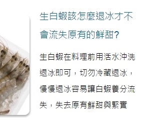 白蝦欲退冰,請直接沖水退冰,千萬別自然室溫或冰箱冷藏室退冰,就有人放冷藏室退24小時才煮,說為何蝦蝦軟軟的。天啊!再好的食材沒有正常正確處理,當然也完了!
