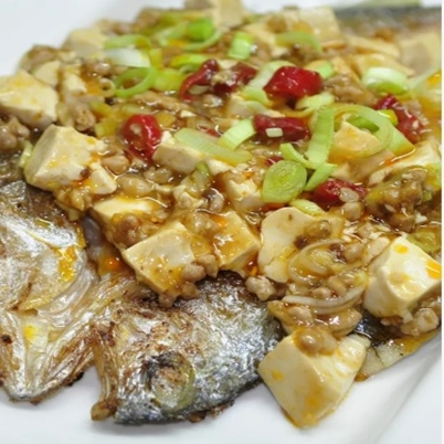 10.將川味豆腐淋在黃魚一夜干上,灑上蒜苗即可上桌了