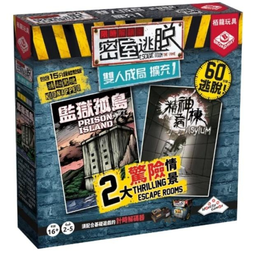 *這款遊戲無法單獨遊玩,需有《限時解鎖:密室逃脫》主遊戲搭配遊玩 世界首套附音效晶片計時儀器的桌上密室遊戲,雙人成局擴充來了! 【遊戲簡介】 嘖嘖募資賣破2,000套,全球銷量突破 200 萬套的限時解鎖:密室逃脫,擴充來啦! 疫情當下,無法去實體密室逃脫沒關係!全新劇本登場! 這款世界首套附音效晶片計時儀器的桌上密室遊戲,讓你在家也能身歷其境,讓你體會時間一分一秒逼近的緊張感..... 這次新增的三個劇本:《監獄孤島》、《精神病棟》、《擄劫驚魂 (15分鐘教學劇本)》 【遊戲資訊】 遊戲人數:2-5人 (人數較無限制,也可1人遊玩) 遊戲時間:60分鐘(一個劇本)、15分鐘(教學劇本) 適合年齡:16+ 【配件內容】 ● 提示牌 x 3份 ● 提示解碼器 x 1個 ● 劇本包 x 3包 - 監獄孤島 - 精神病棟 - 擄劫驚魂 (15分鐘教學劇本)