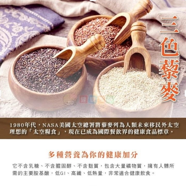 【商品特色】 1980年代,NASA美國太空總署將藜麥列為 人類未來移民外太空理想的「太空糧食」, 現在已成為國際餐飲界的健康食品標章。