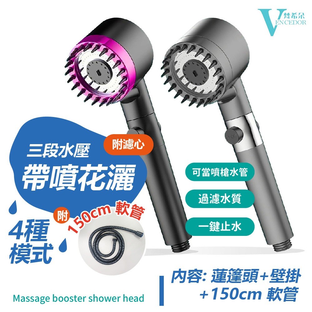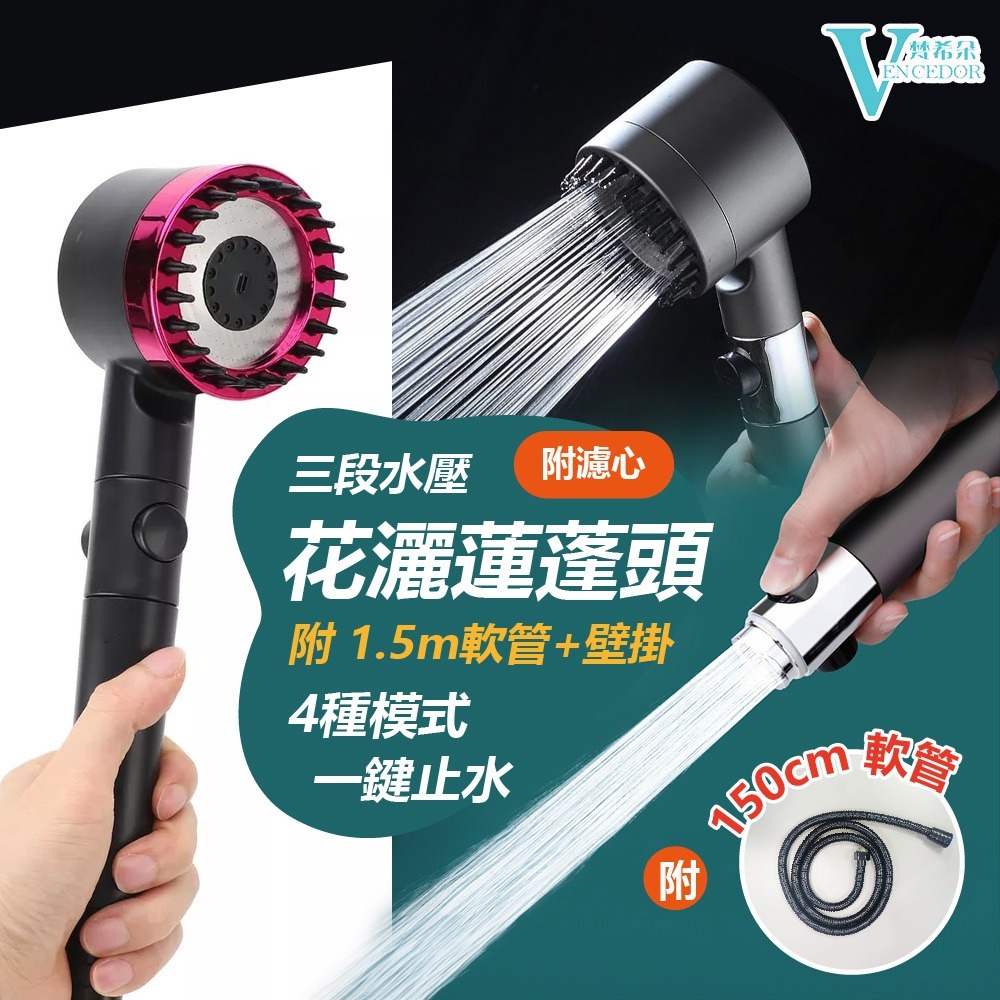 【VENCEDOR】 三段式水壓花灑 贈1.5M水管 增壓花灑 可過濾可調節蓮蓬頭高壓 現貨 滿499免運