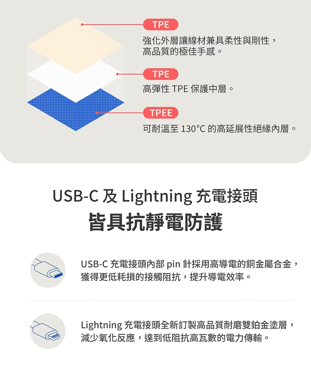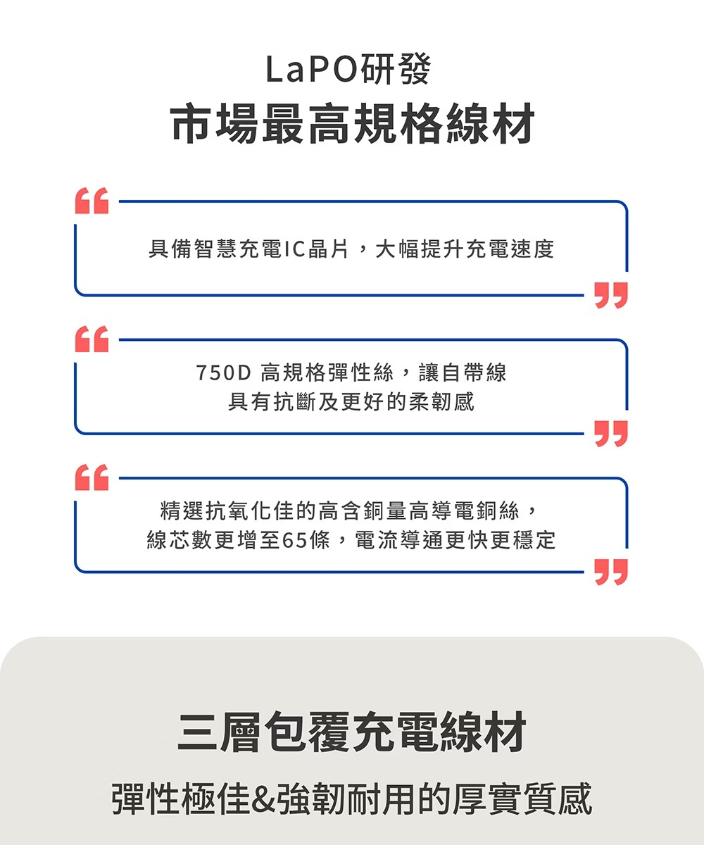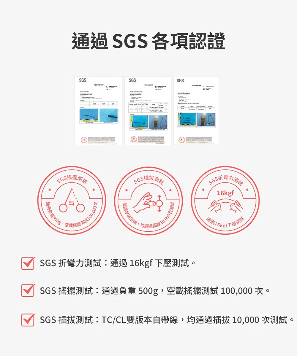 • 自帶線通過SGS 10萬次彎折/搖擺測試,為業界最高規格
