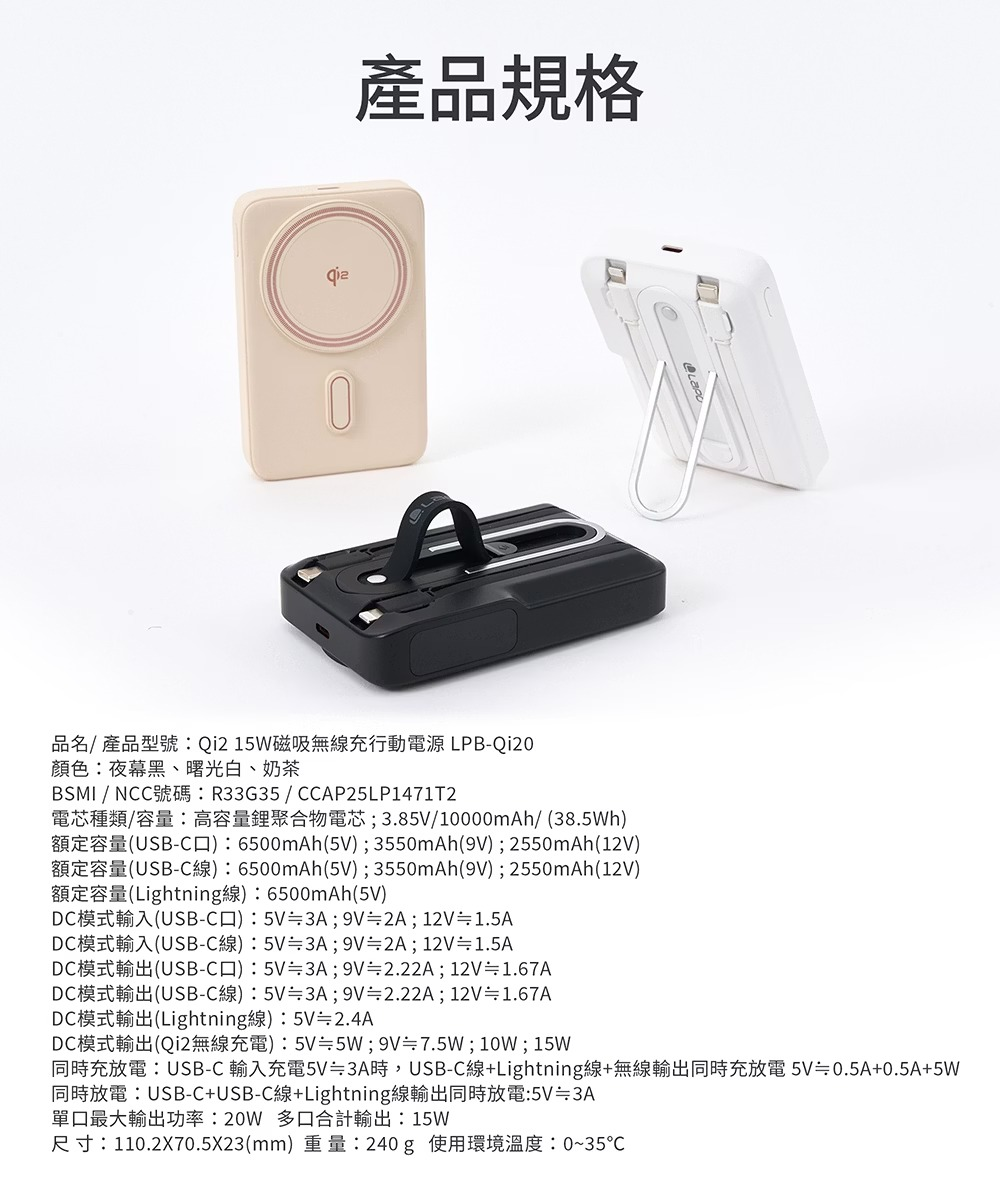 • 通過WPC無線充電聯盟Qi2測試標準認證,最高15W無線快速充電 ・TFT彩色液晶顯示螢幕,電量狀態、充電輸出/入數據一覽無遺 13N 強力磁吸環+防滑矽膠,吸附更穩定