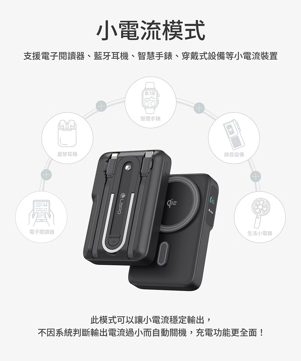 • 具備「小電流模式」,支援藍牙耳機、智慧穿戴裝置、電子書等裝置充電