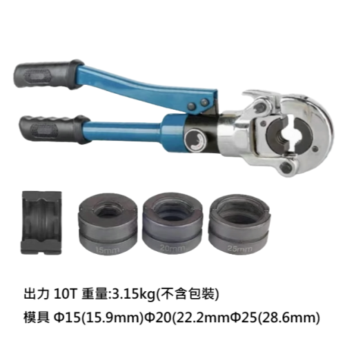 不鏽鋼壓管工具、管子鉗 油壓壓管鉗壓接省力,一次性壓接成功,壓接速度快,絕緣手柄, 握感舒適,適用于不鏽鋼管壓接。 配置模具: Φ15/20/25mm2 出力: 10T 重量: 3.15kg 本體長度: 380mm
