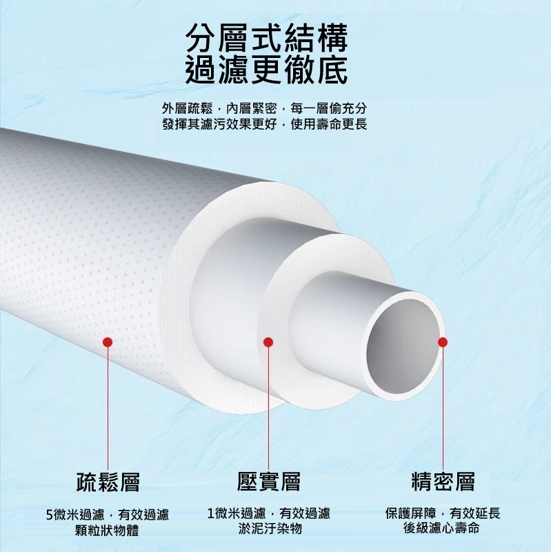 功能:可有效去除水中泥沙、鐵銹、石灰等雜質固體沉澱物