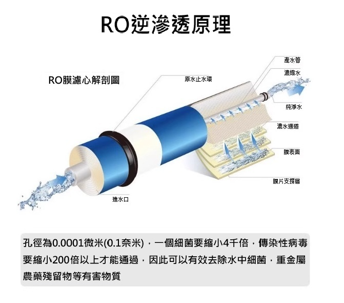1.孔徑 0.0001微米,日造水量 75G (加侖)造水量。