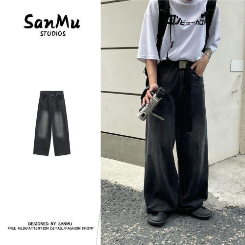 日係複古水洗做舊垂感拖地牛仔褲男秋季穿搭潮流寬鬆百搭闊腿長褲