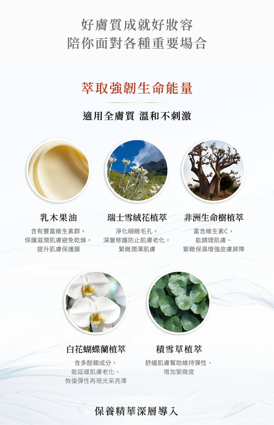 大自然的饋贈植物萃取-瑞士雪絨花、非洲生命樹、白花蝴蝶蘭、澳洲魚子檸檬