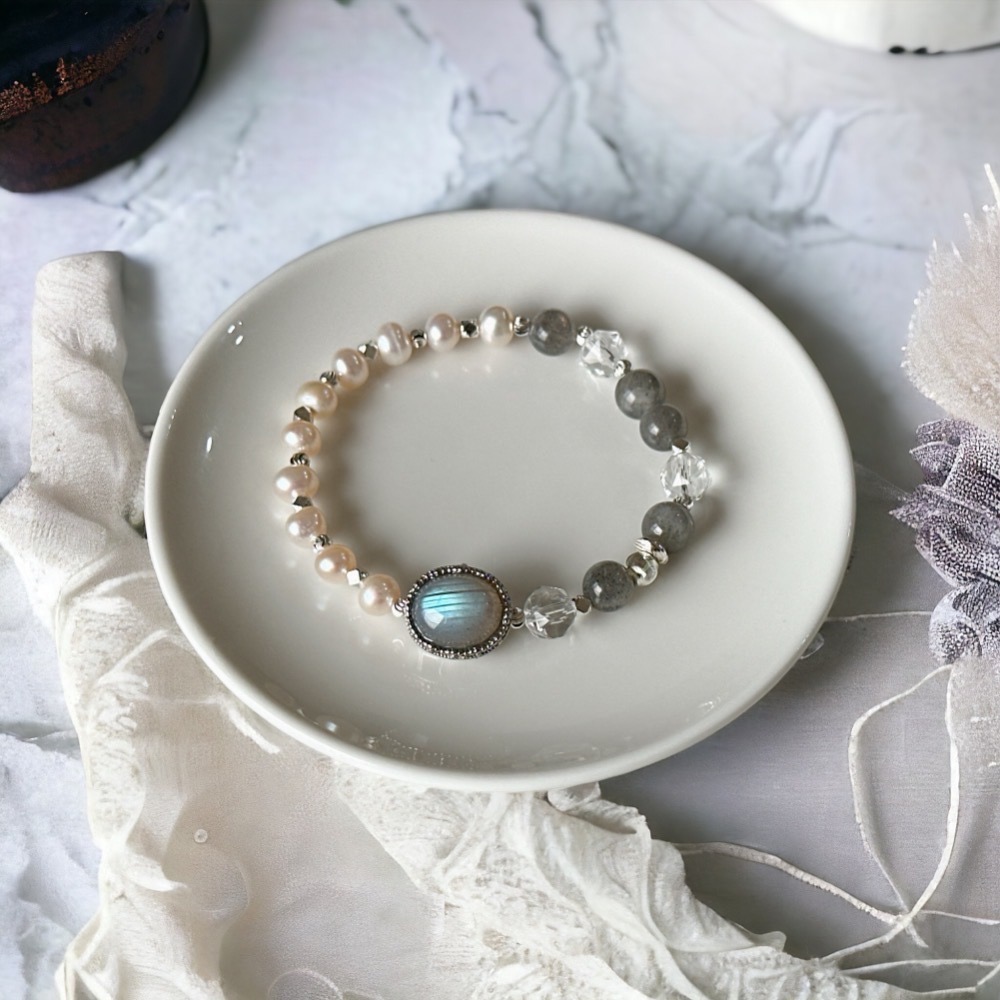 水晶大小:7mm / 珍珠大小:6mm / 拉長石蛋面大小:13*14mm