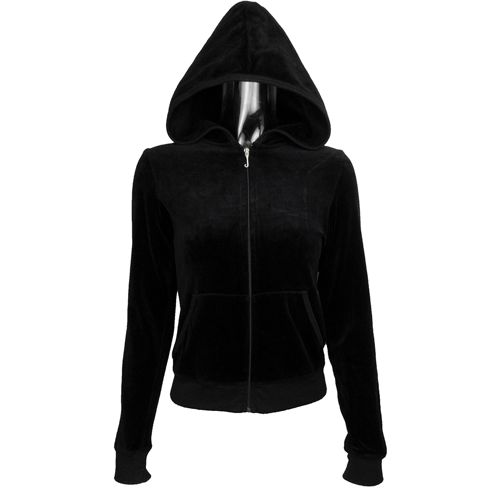 Description:美國時尚品牌Juicy Couture黑色天鵝絨背後圖騰印花長袖連帽外套