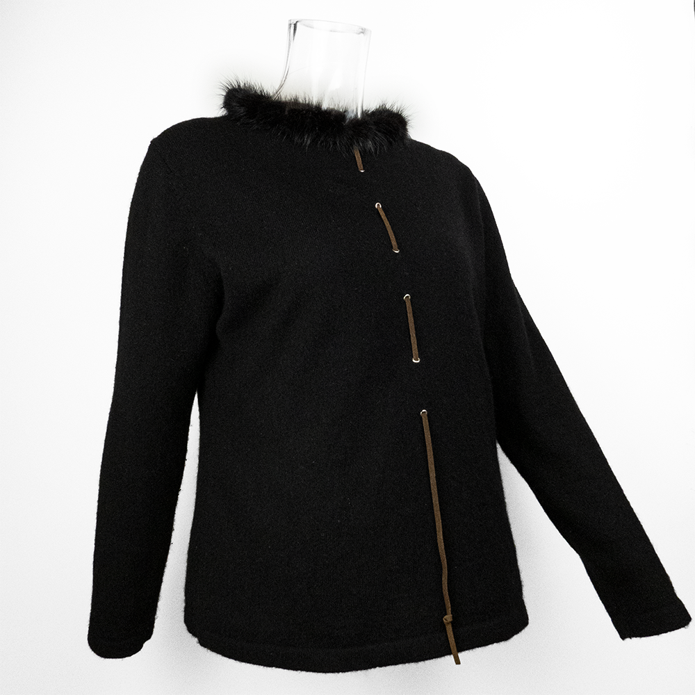 Description:義大利品牌Green Grass黑色喀什米爾羊毛貂皮滾邊領口長袖毛衣
