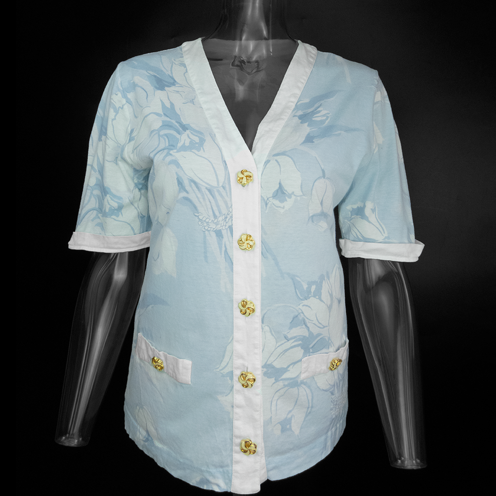 Description:義大利品牌Vedette淺藍色純棉鬱金香花束反摺短袖外套