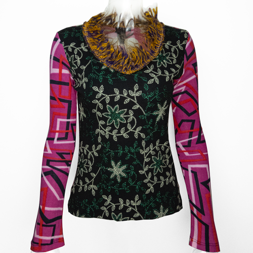 Description:西班牙品牌CUSTO盤花刺繡幾何拼接毛線抽鬚長袖上衣