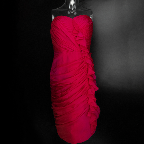 Description:美國設計師品牌Carmen Marc Valvo桃紅色純蠶絲抓褶露肩無袖洋裝