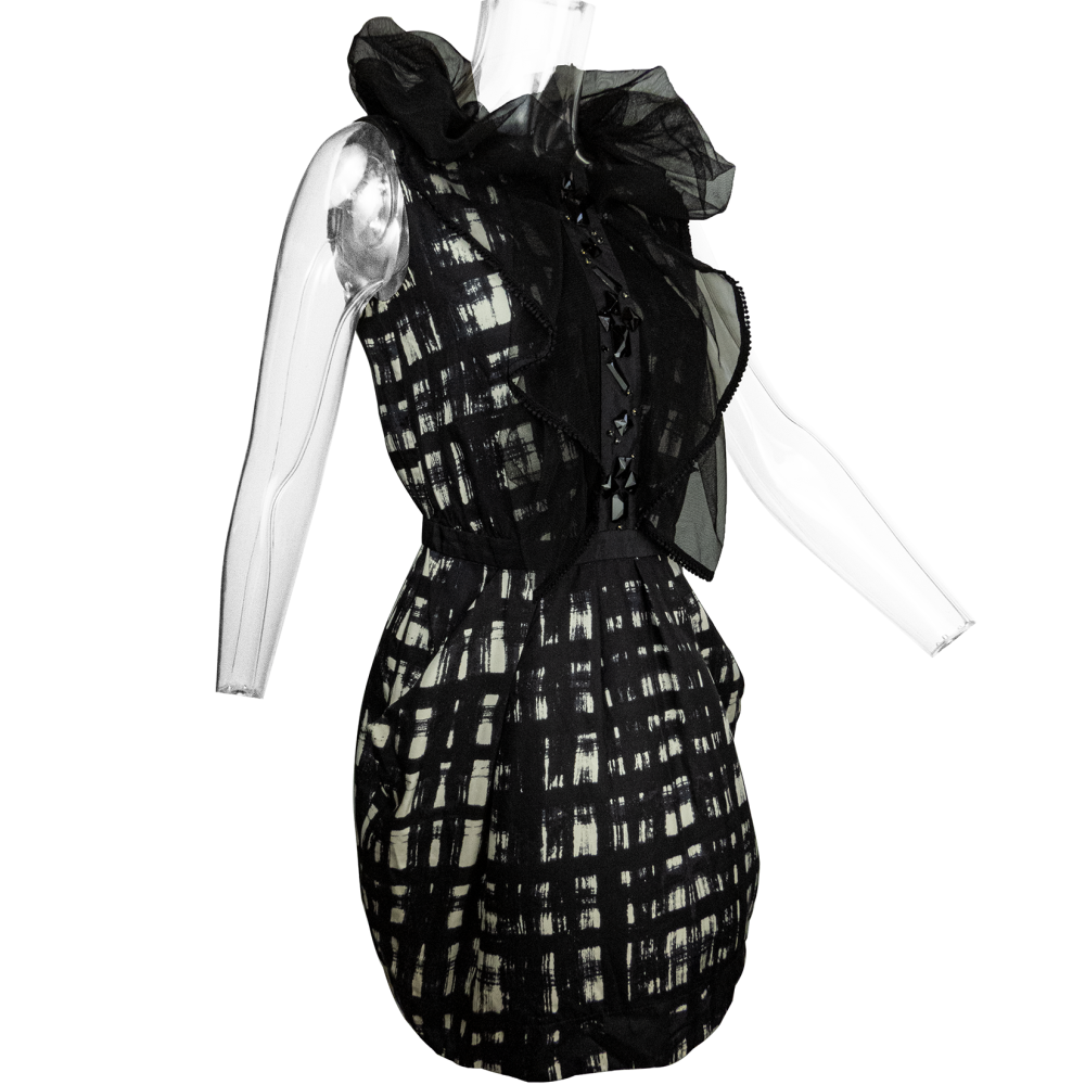 Description:台灣時裝設計師品牌CHARINYEH 葉珈伶純蠶絲網紗抓褶寶石無袖洋裝