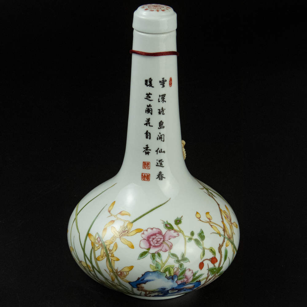 Description:台灣光復四十週年紀念 仿國立故宮博物院藏品琺瑯花卉錐把瓶 台灣菸酒公賣局