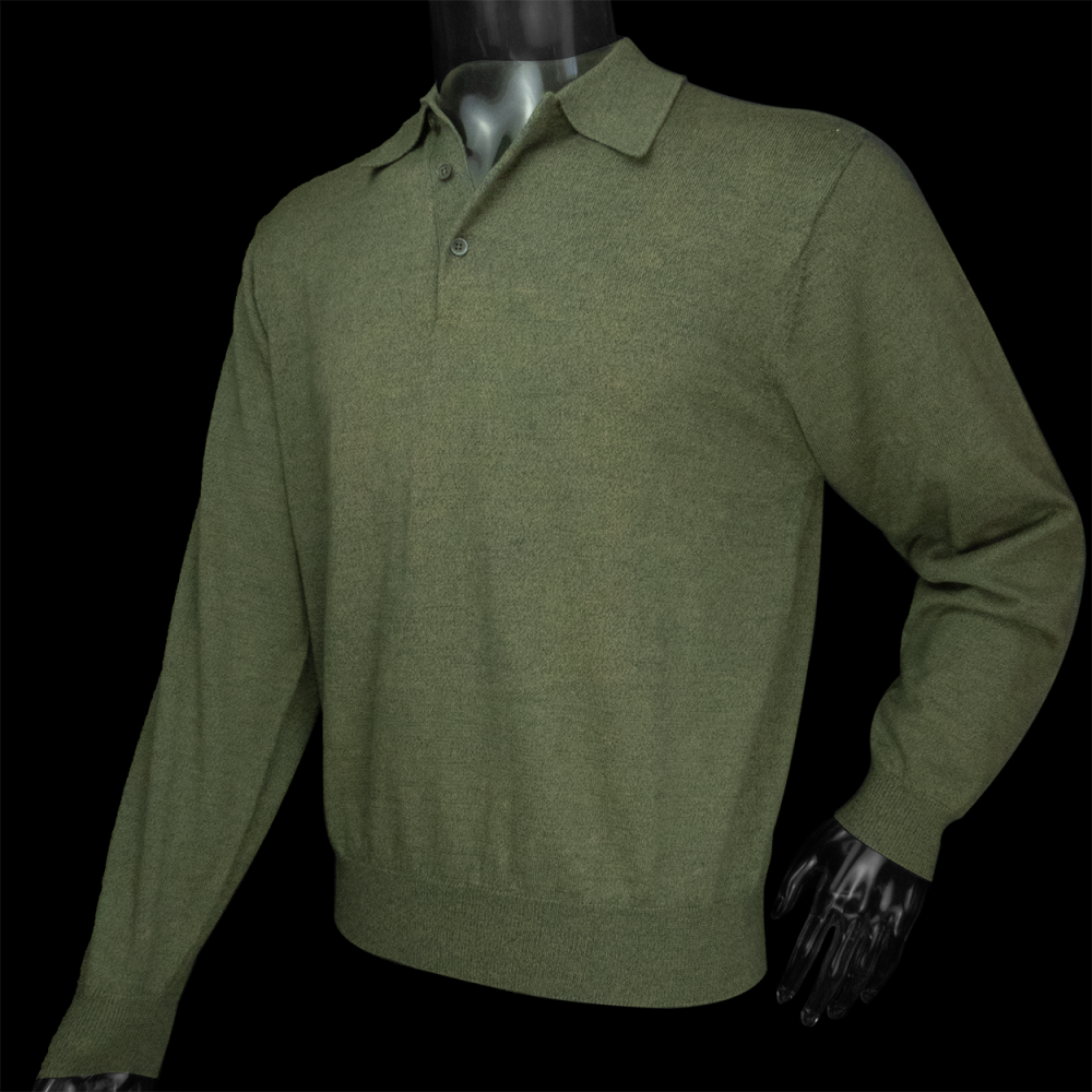 Description:美國老字號品牌Brooks Brothers青苔色美麗諾羊毛素面POLO領長袖毛衣