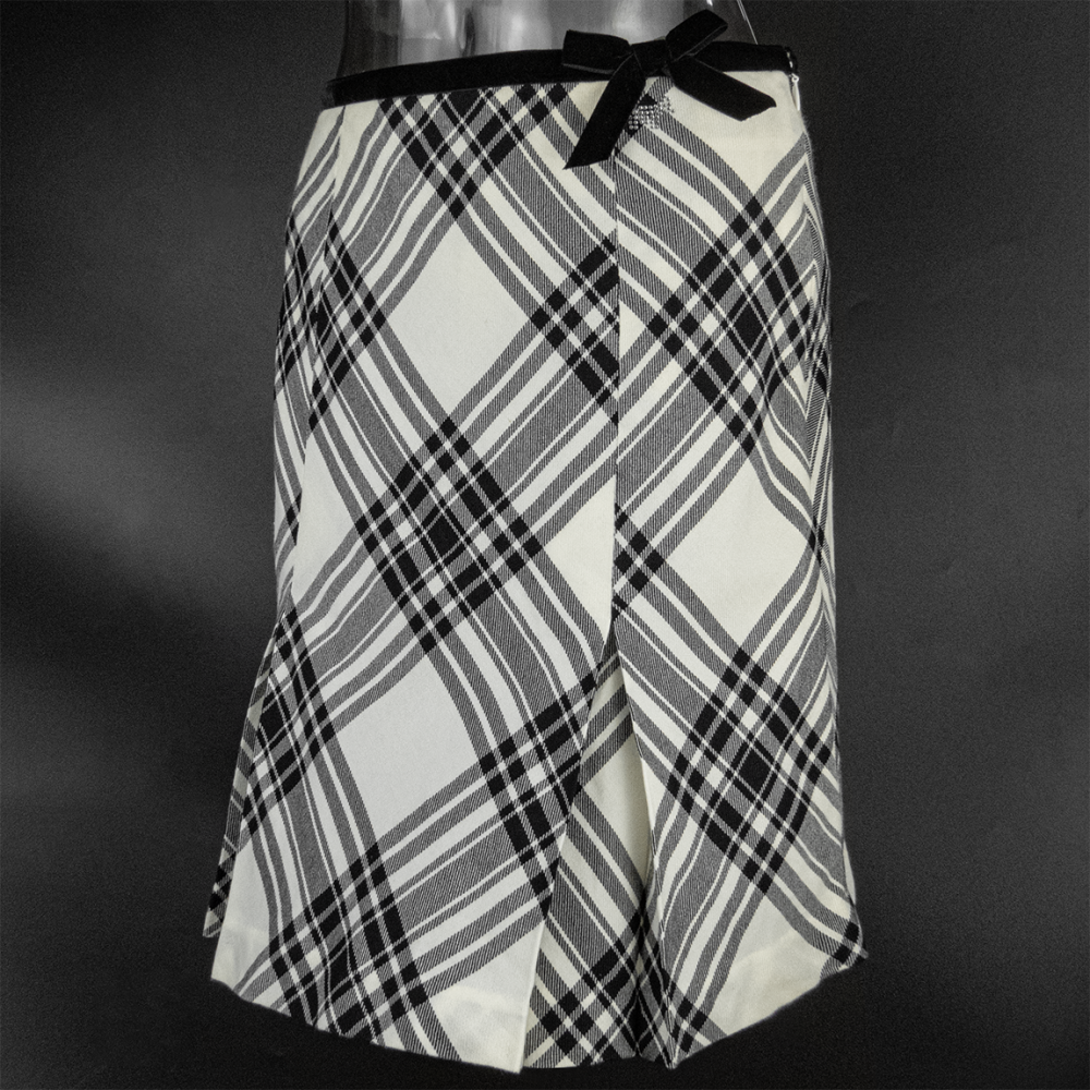 Description: 專櫃SCOTTISH HOUSE 小狗牌米色純羊毛經典格紋蝴蝶結抓褶及膝裙