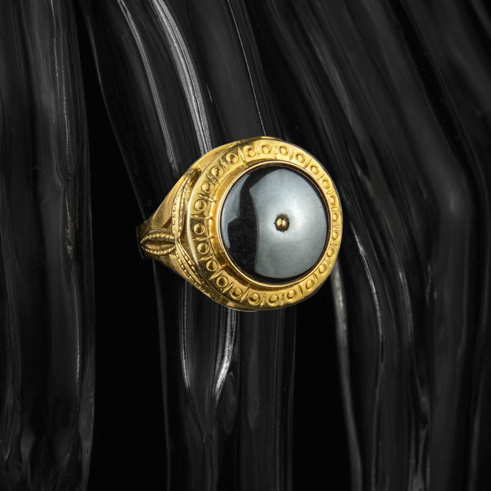 Description:18K金羅馬風格造型黑膽石鑲嵌三葉草戒指 老件