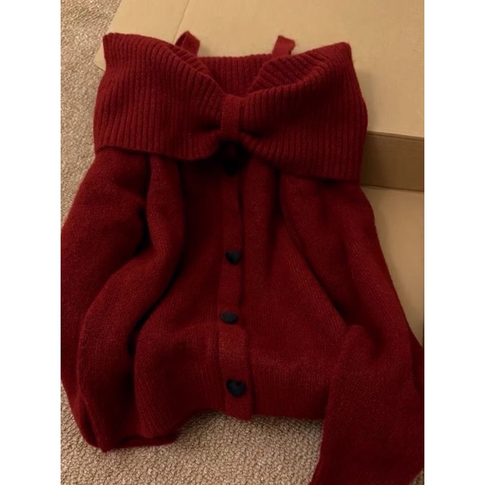 OLISI 紅色一字肩蝴蝶結毛衣女秋冬