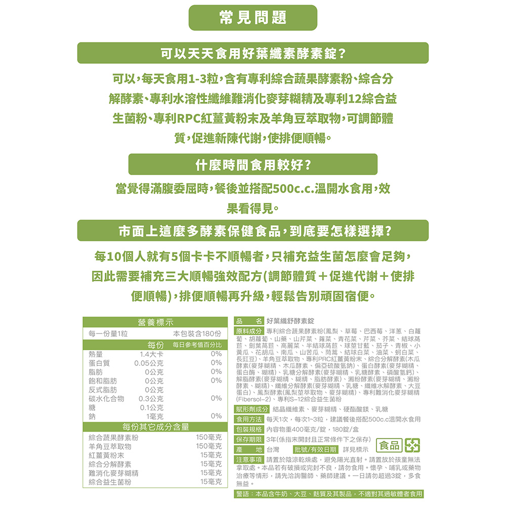 好葉 纖舒酵素錠 180錠/盒(綜合益生菌)