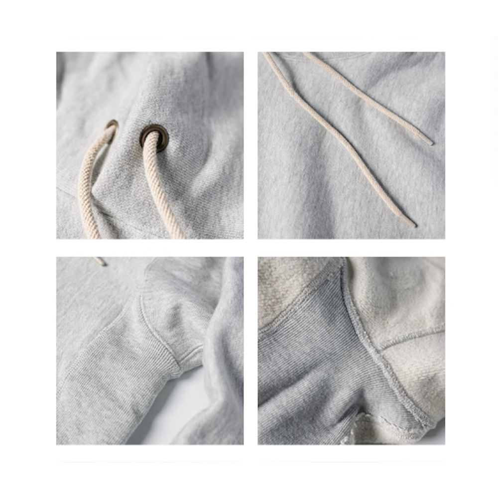 採用1952年專利的REVERSE WEAVE橫紋針織技術,肩部無縫結構與側身彈性螺紋拼接設計,能有效防止布料水平收縮,提升活動便利性與服裝耐用度。600克重磅毛圈布料,經普洗定型處理,厚實耐穿。