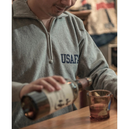 以 1950 年代「美國空軍官校(USAFA)」訓練衛衣為復刻藍本,還原當時常見的半拉鍊式運動衫。採用 17.6 oz 重磅毛巾布製成,手感紮實,運動寬鬆剪裁,方便活動。半拉鍊配置經典耐用的 TALON 拉鍊,日常層次與機能兼具。