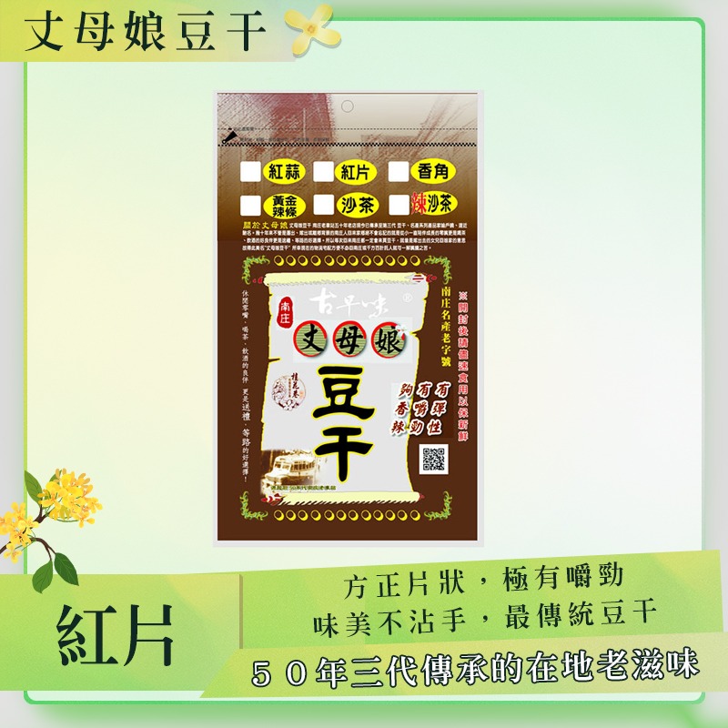 方正片狀,極有嚼勁,味美不沾手,最傳統的豆干喔!