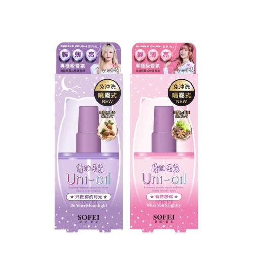 【舒妃SOFEI】-舒妃UNI優油美露100ml- 有點想你/只做你的月光 ❣️商品特色 *噴霧式修護髮油 *輕盈薄霧 輕薄不厚重 *滋養x保濕x修護 *柔順x彈性x潤澤 ✅細緻方便 ✅不沾手✅ 不油膩 ✅輕薄不厚重✅專櫃級香氛 ❣️商品規格 *容量:100ML *用法:使用時避開頭皮,均勻噴至中段及尾段的髮絲上,再利用手指或梳子整理即可。免沖洗。 *使用注意事項:如有任何不適及過敏症狀,請立即停用,並諮詢專業醫師意見。 *保存方法請置於陰涼處,避免陽光直射。