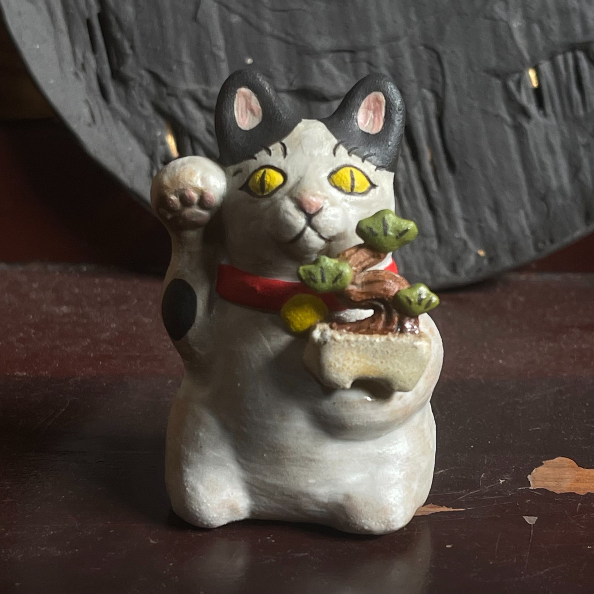 「拿著小松樹的白盆景小小乳牛招財貓」