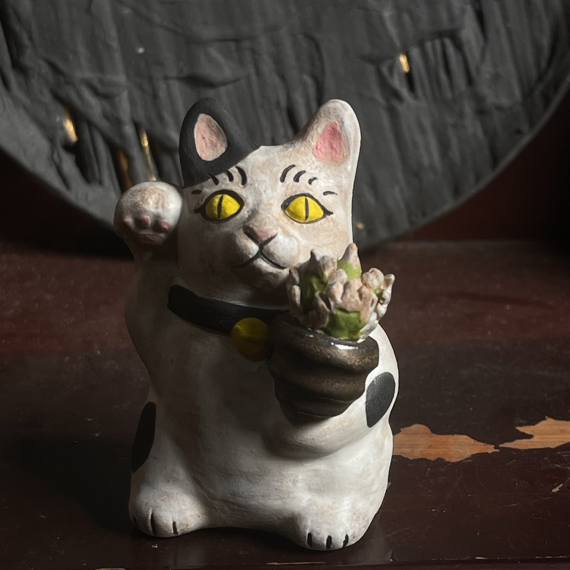 「胖胖貓園藝師,抱著嚴龍盆景的乳牛貓招財貓」