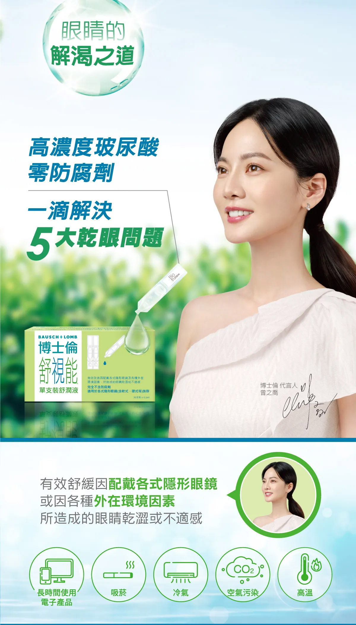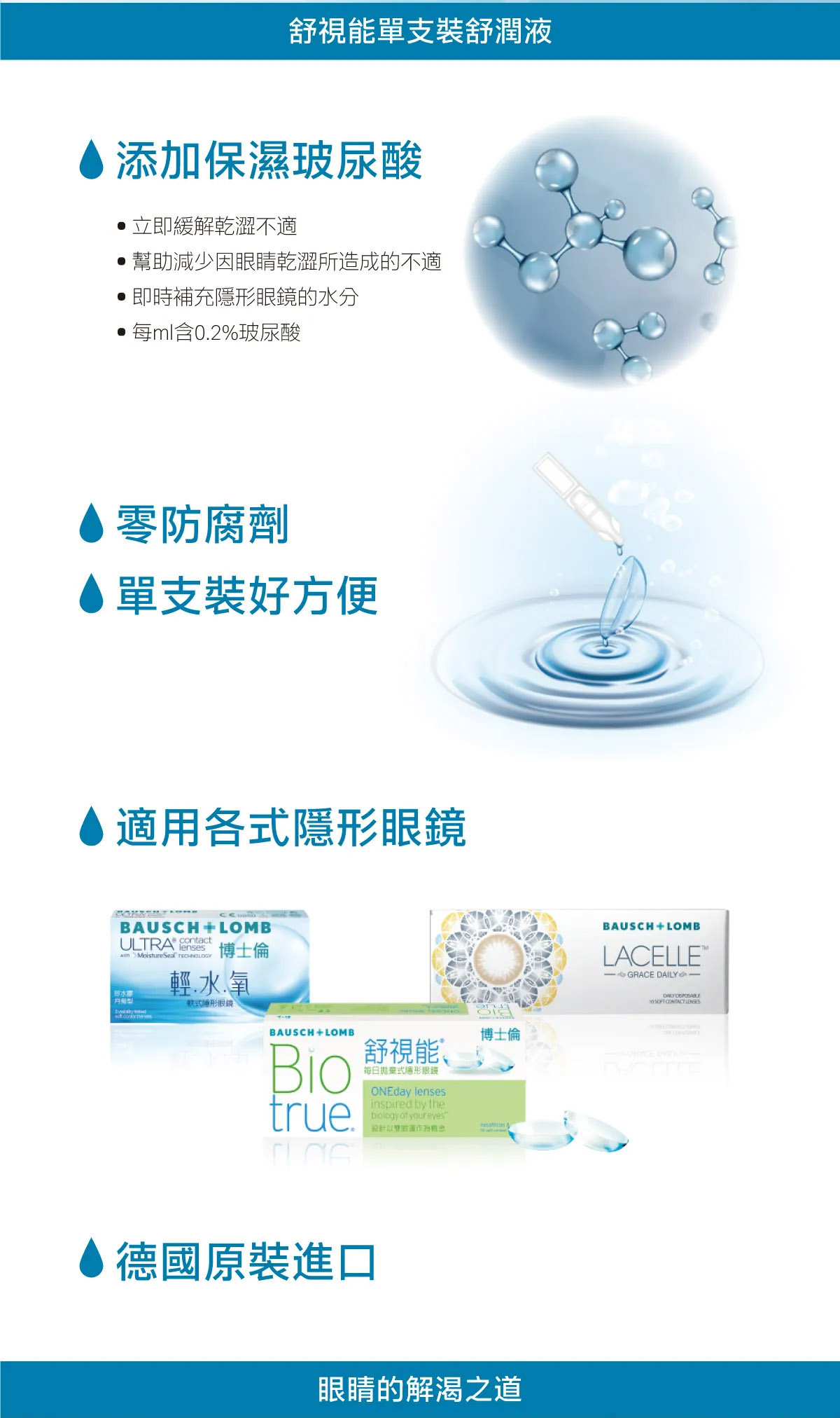 特色/作用:有效改善因配戴各式隱形眼鏡及各種外在環境因素,所造成的眼睛乾澀或不適感。適用於各式隱形眼鏡(含軟式、硬式等)族群