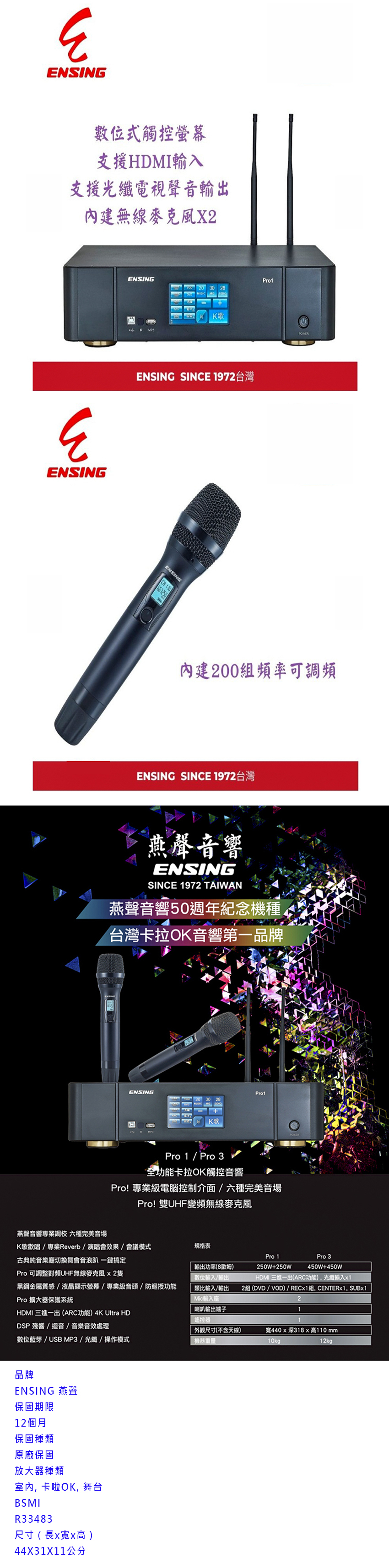 ENSING 燕聲 Pro3 數位式擴大機單聲道450瓦/HDMI三進一出/藍芽/USB/光纖/2支手持無線麥克風