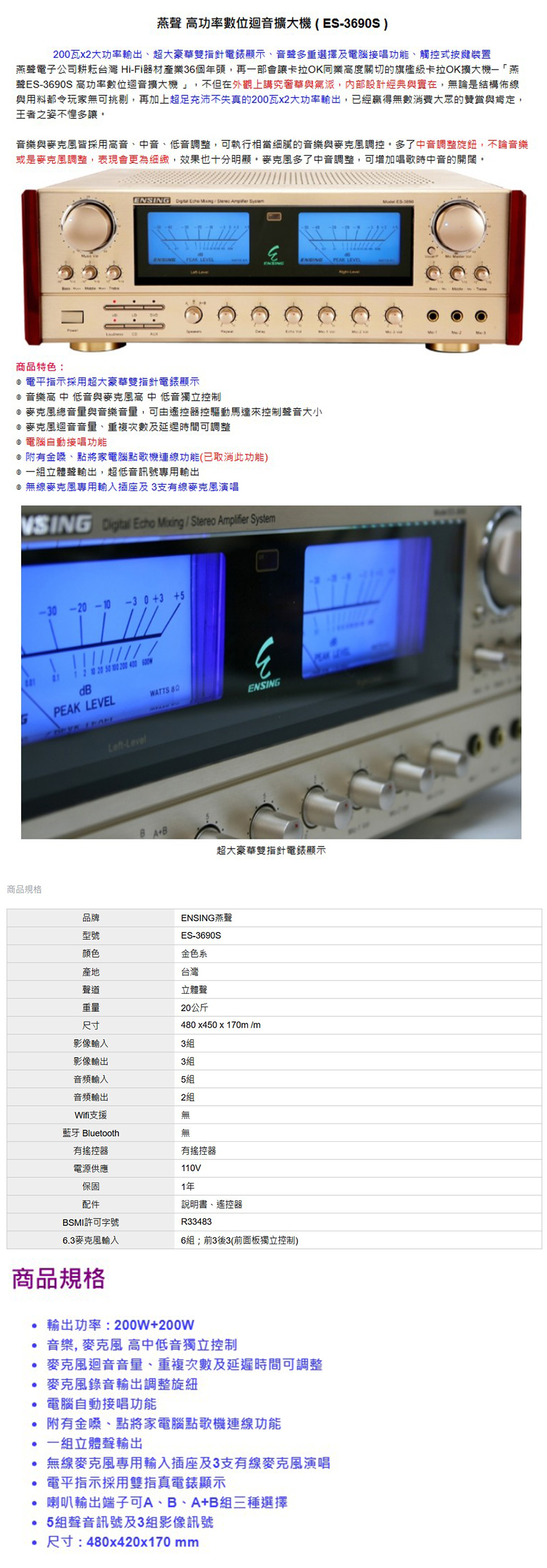 燕聲ENSING ES-3690S 紅外線遙控高功率數位迴音擴大機/卡拉OK/KTV混音擴大機200W