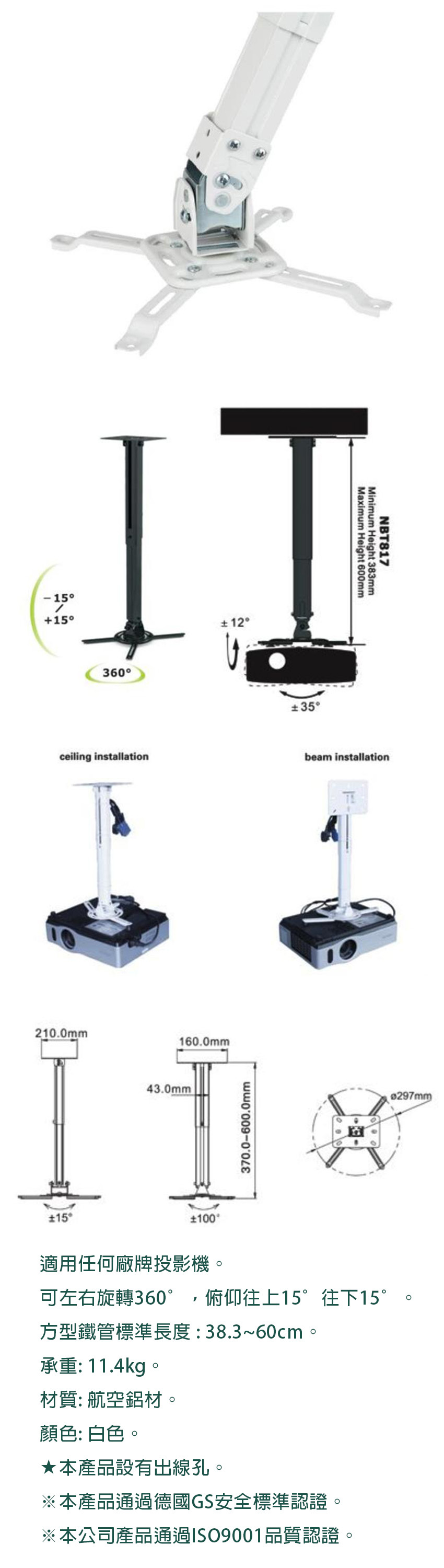 NB T-817-60 萬用型投影機懸吊架/天吊架 適用各大廠牌 可360°旋轉