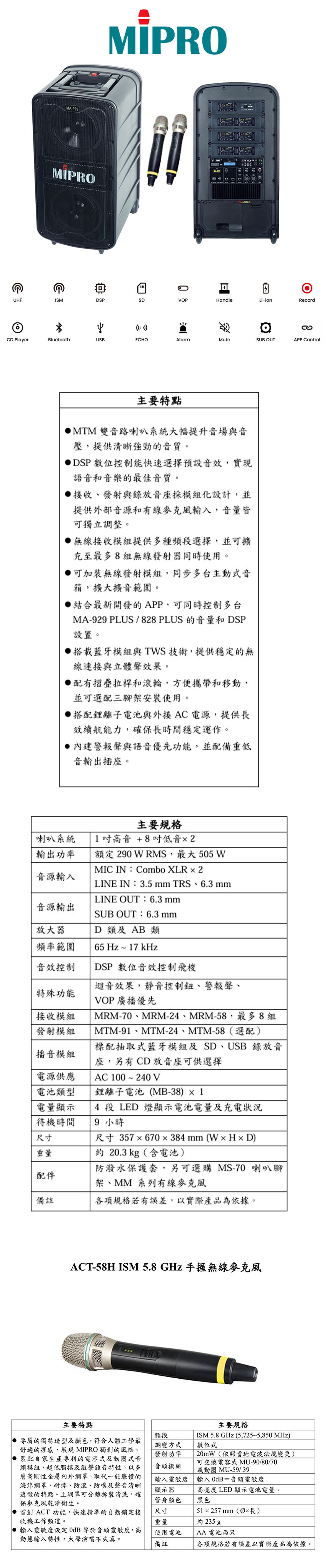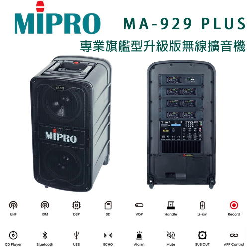 MIPRO MA-929 PLUS 專業旗艦型升級版行動拉桿式無線雙頻麥克風擴音機
