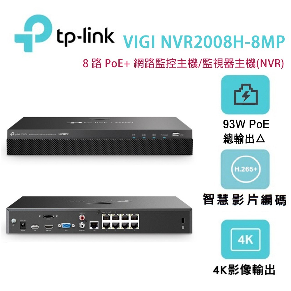 TP-Link VIGI NVR2008H-8MP(UN) 8 路PoE 網路監控主機/監視器主機(NVR)