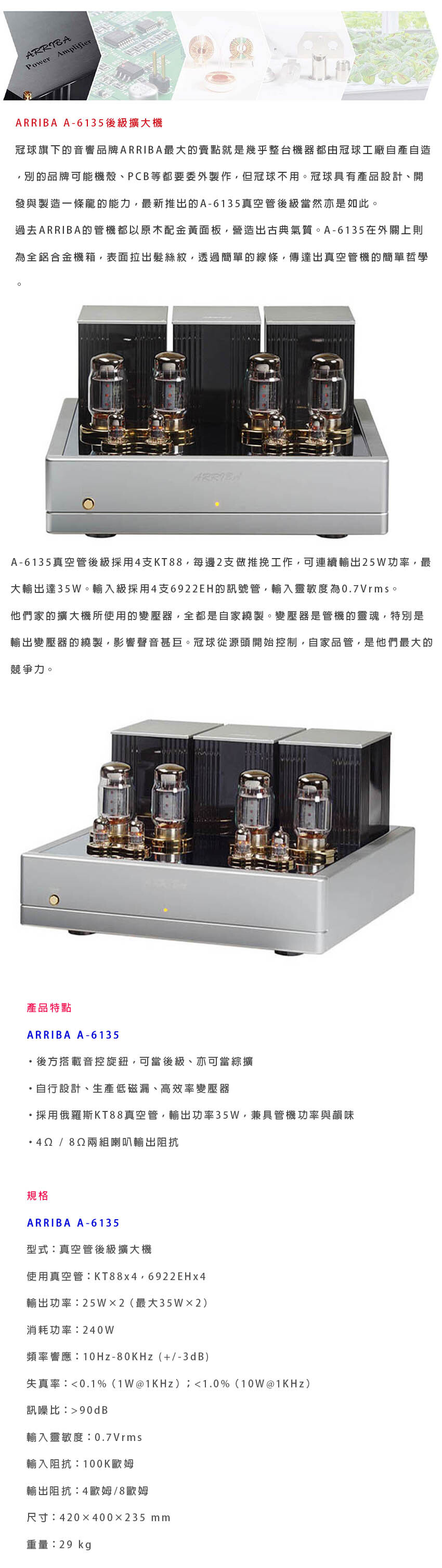 冠球 ARRIBA AUDIO A-6135 真空管後級擴大機