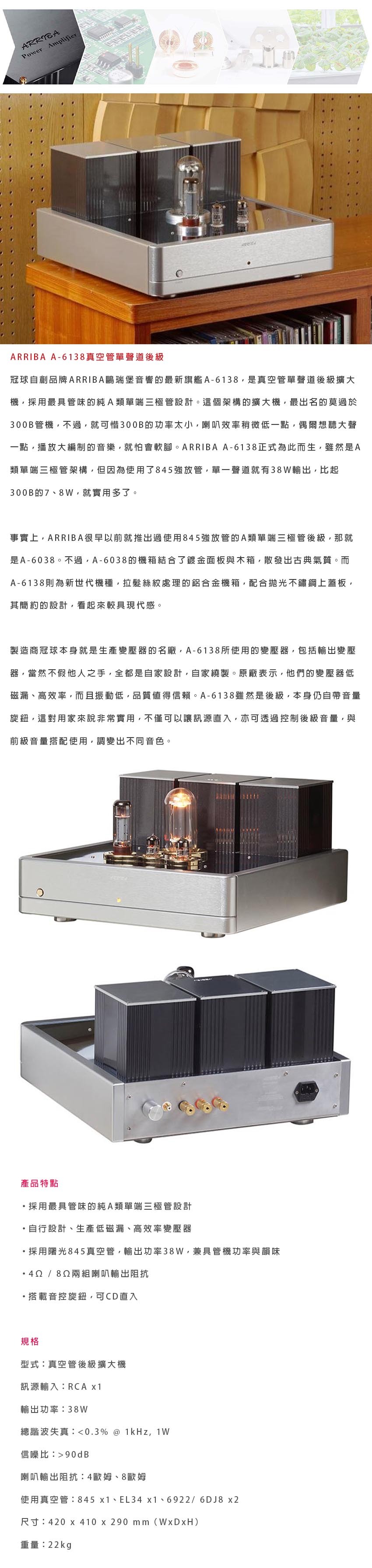 冠球 ARRIBA AUDIO A-6138 真空管單聲道後級擴大機/組