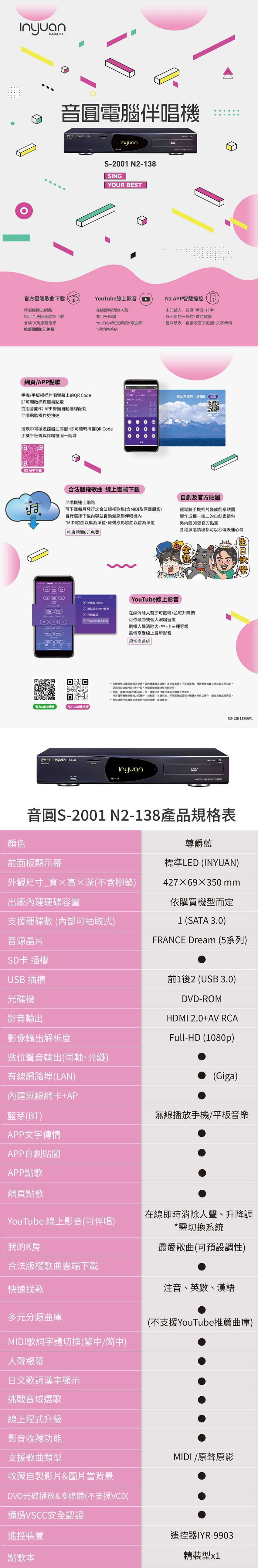 Inyuan 音圓 S-2001 N2-138 專業型卡拉OK點歌機 4TB 家用KTV YouTube人聲消音