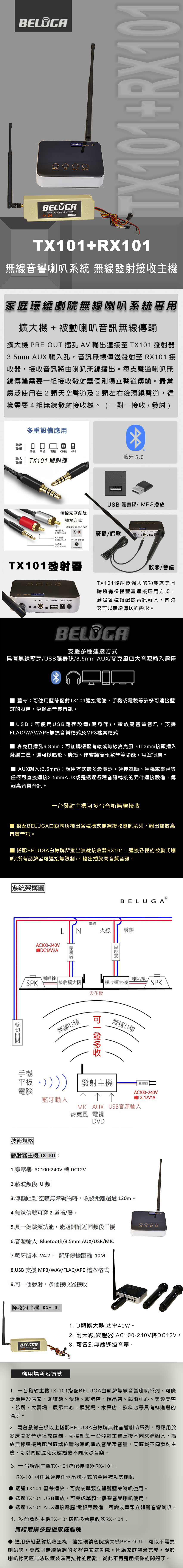 BELUGA 白鯨牌 TX101+RX101藍芽無線發射接收主機 / 搭配無線家庭劇院音響不需拉線